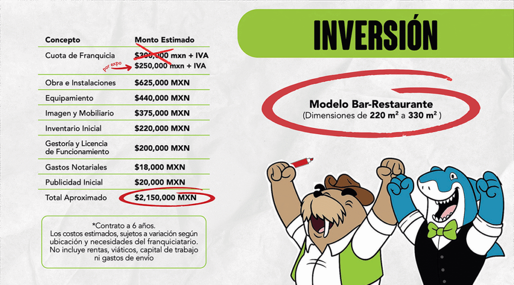 Contrato a 6 años. Los costos estimados, sujetos a variación según ubicación y necesidades del franquiciatario. No incluye rentas, viáticos, capital de trabajo nbi gastos de envío.
